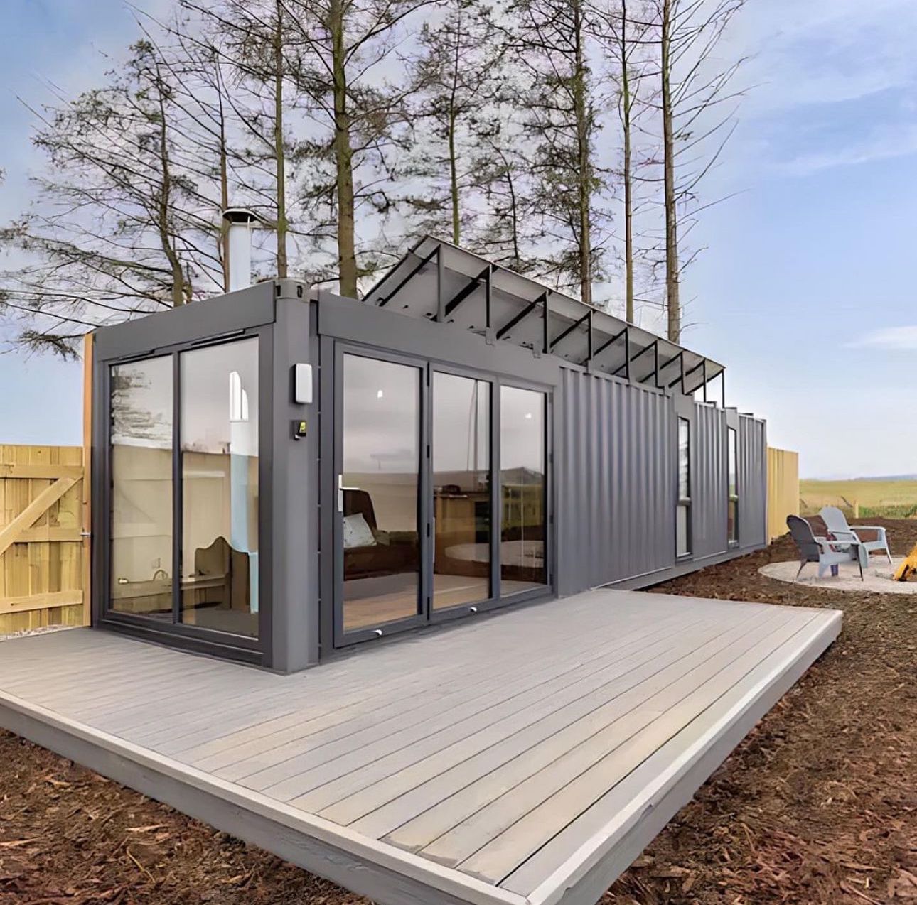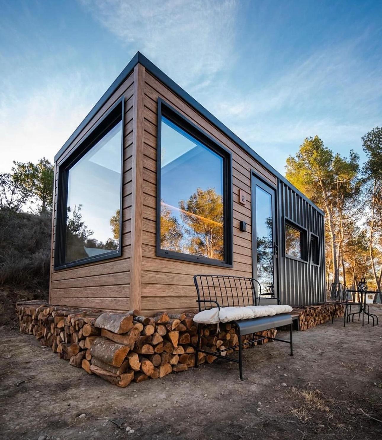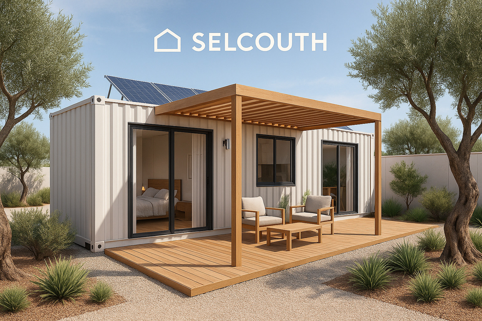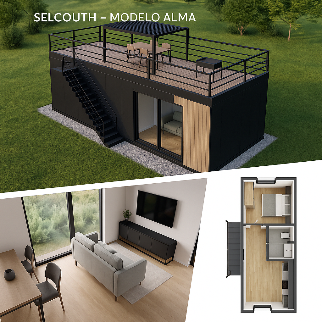 SELCOUTH – MODELO NORA "Nora" sugiere funcionalidad, diseño y autonomía, ideal para una vivienda modular minimalista y luminosa como esta. • Color blanco perla • Puerta lateral • Ventanal amplio en la zona lateral •Barandillas perimetrales en la escalera • Sistema solar integrado